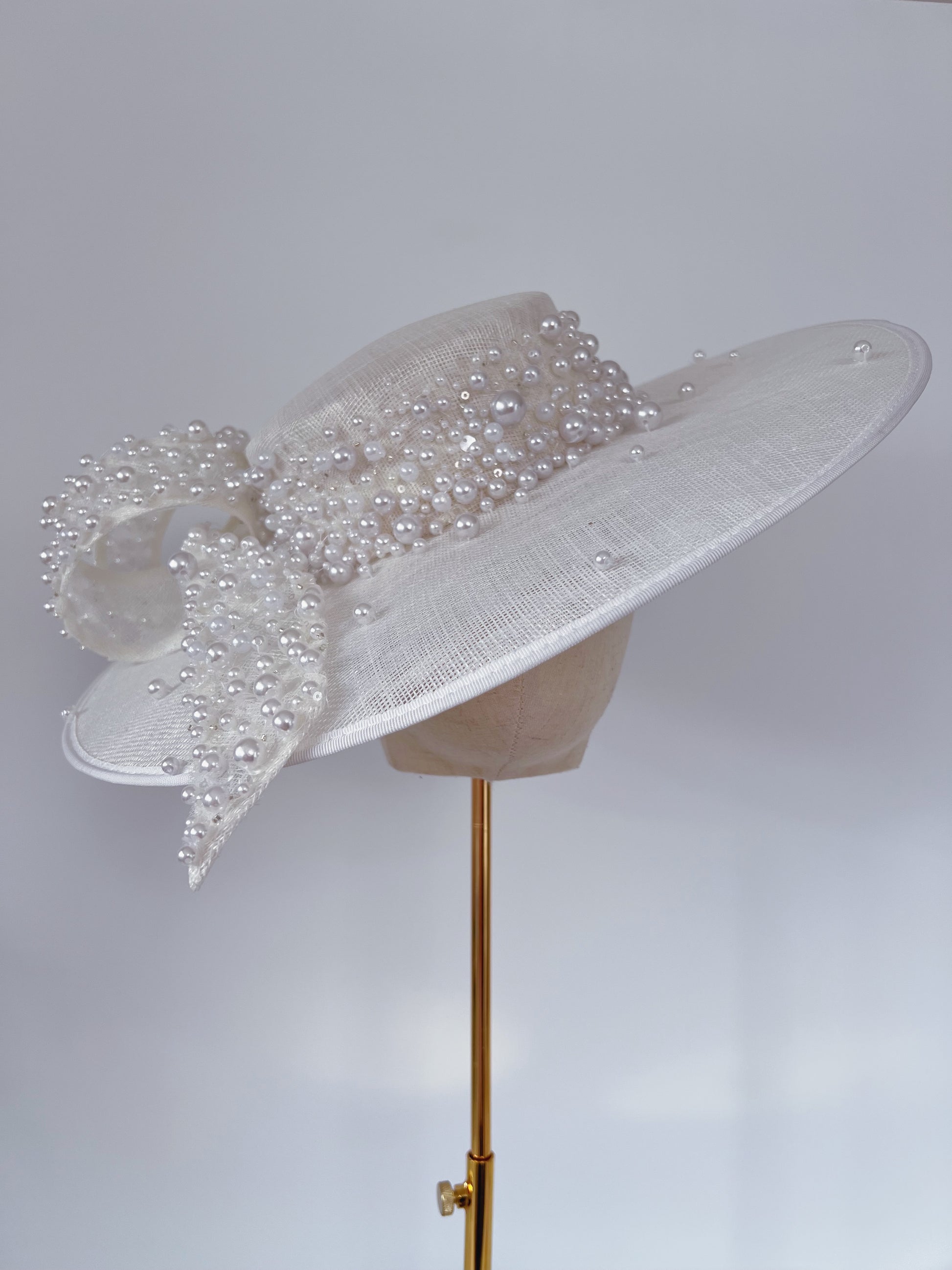 On this custom-made hat, crafted to compliment a wedding outfit, every single pearls is stitched individually, adding an exquisite touch of elegance