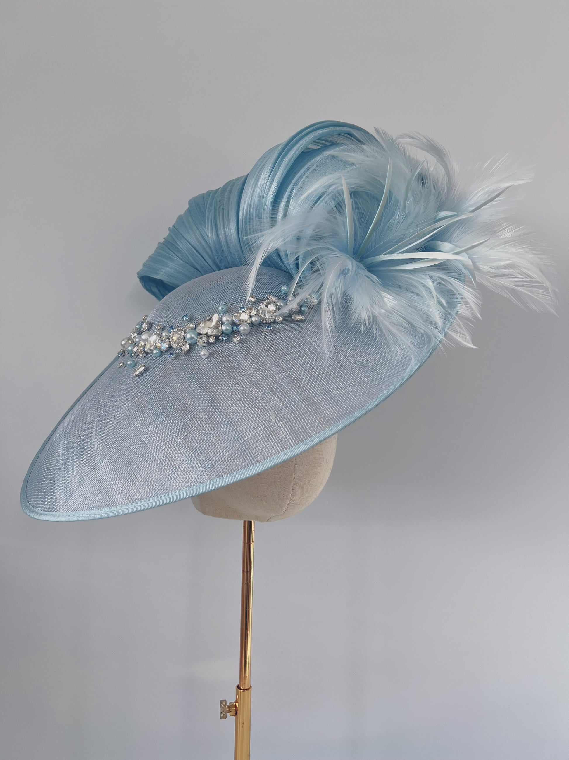 A stunning hat crafted from luxurious silk abaca, adorned with delicate feathers and beautifully shimmering blue rhinestones. Available to buy now or to order in bespoke colourways.