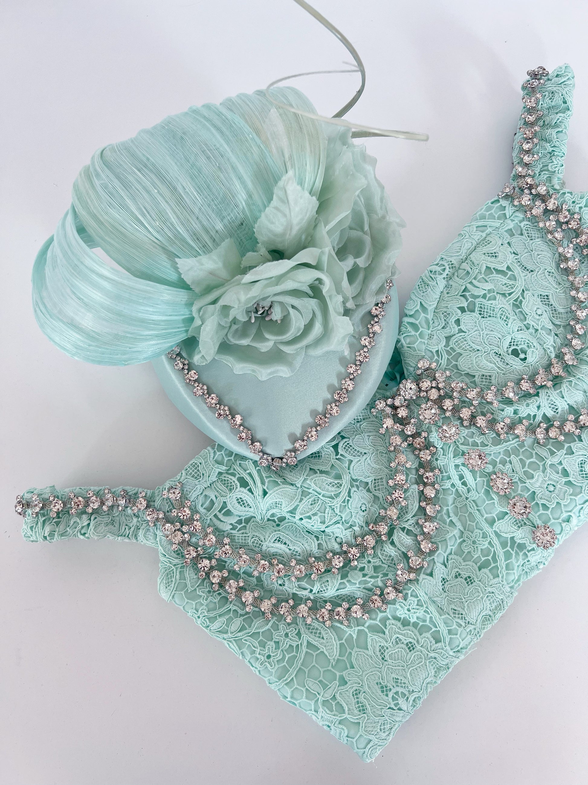 Made to match fascinator in mint, adorned with silk abaca, roses and diamonds