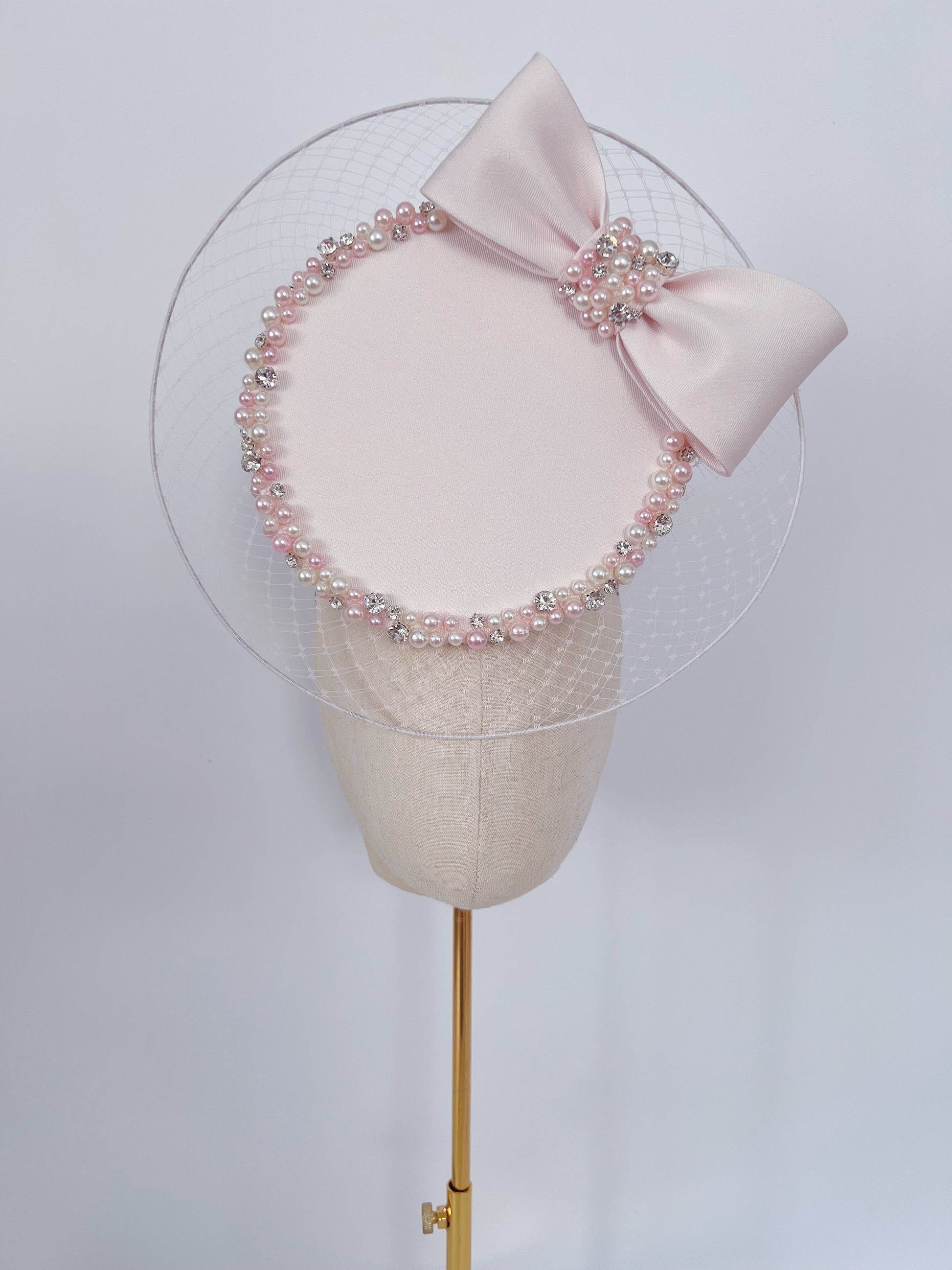 Bespoke headpiece made from the same fabric as the dress, decorated with a bow and shimmering beads