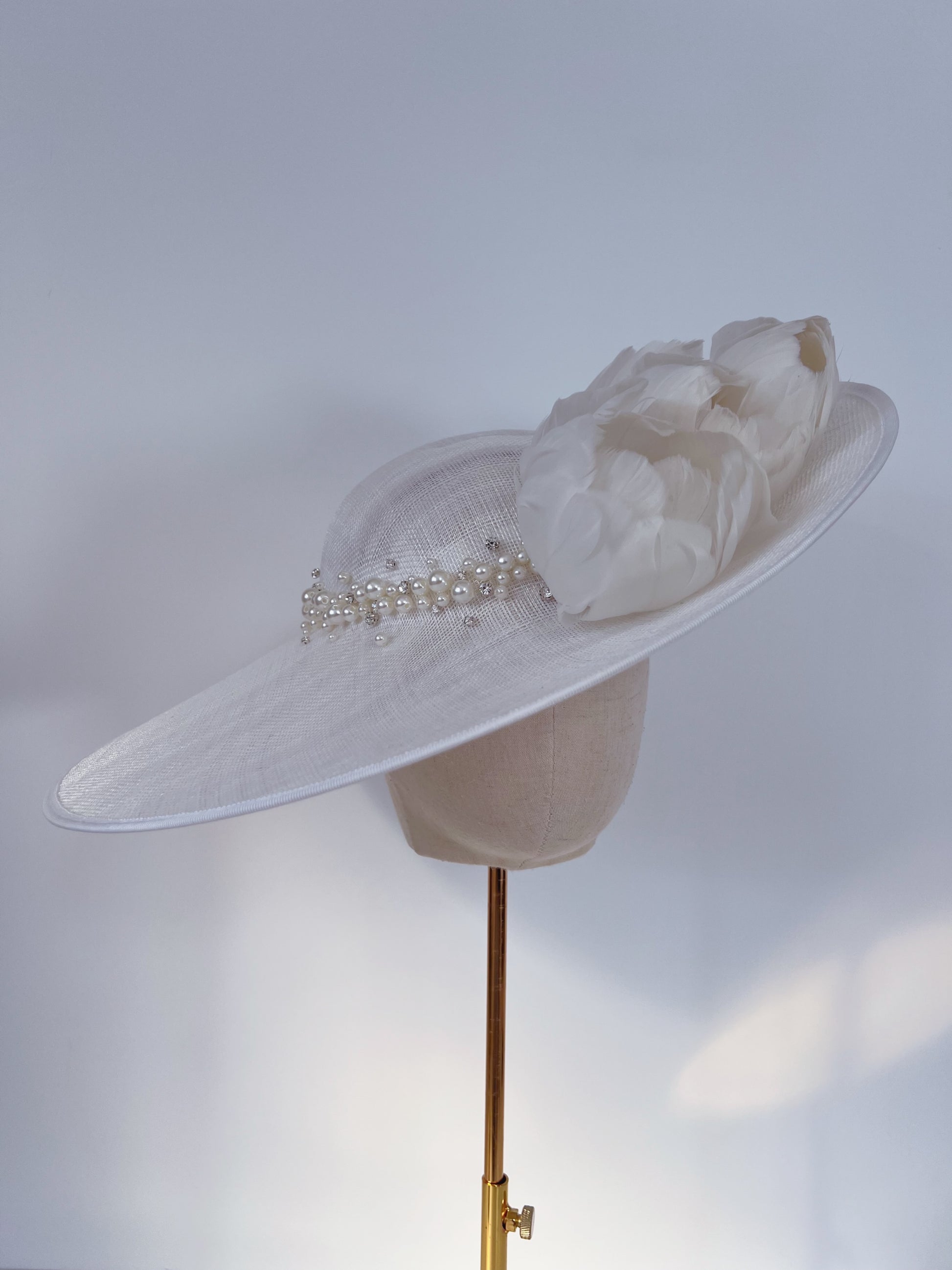 Hat in ivory with delicate tulip-shaped goose nagoire feathers, adorned with pearls and crystals