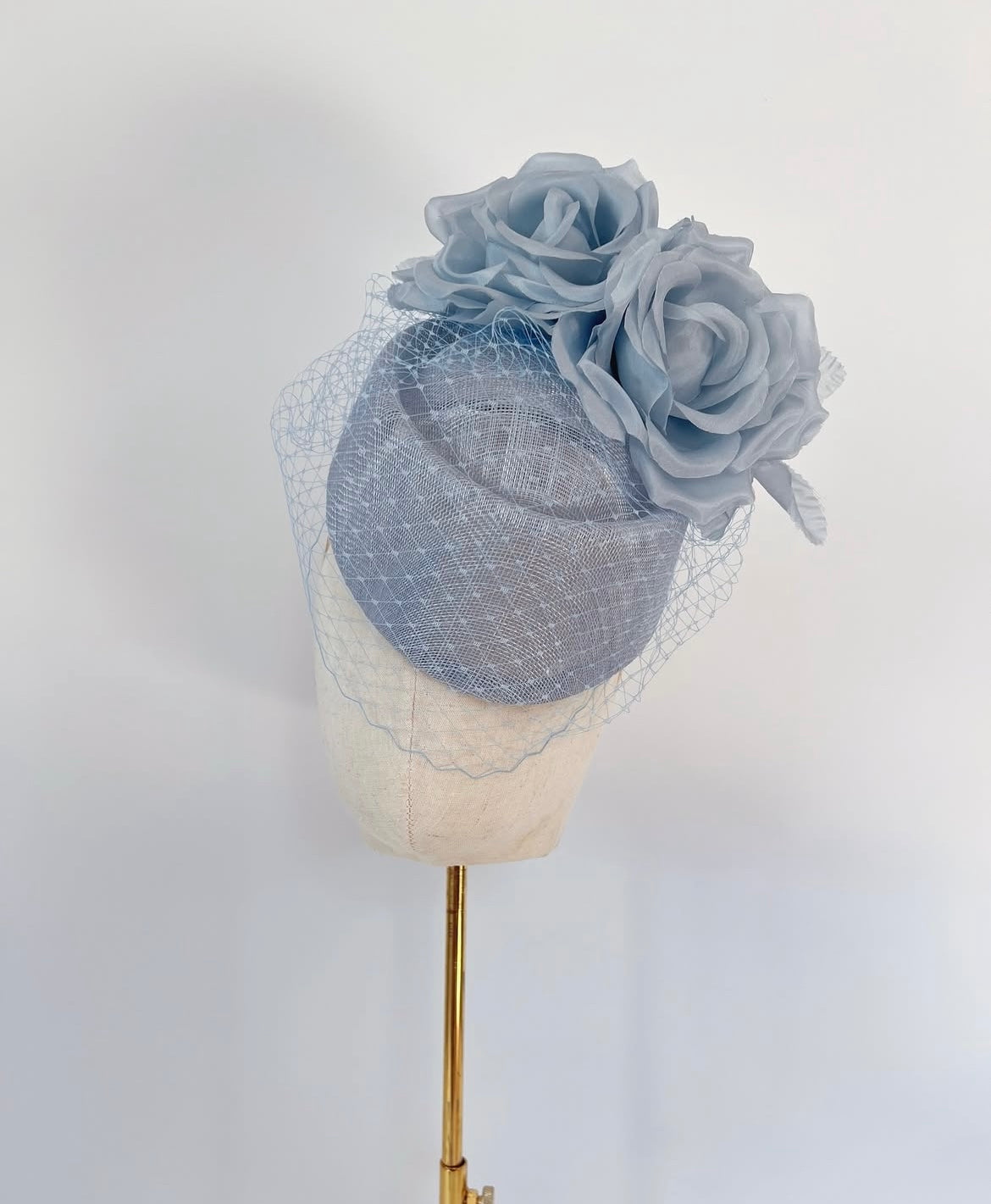 Elegant pillbox in blue adorned with silk roses and delicate veiling