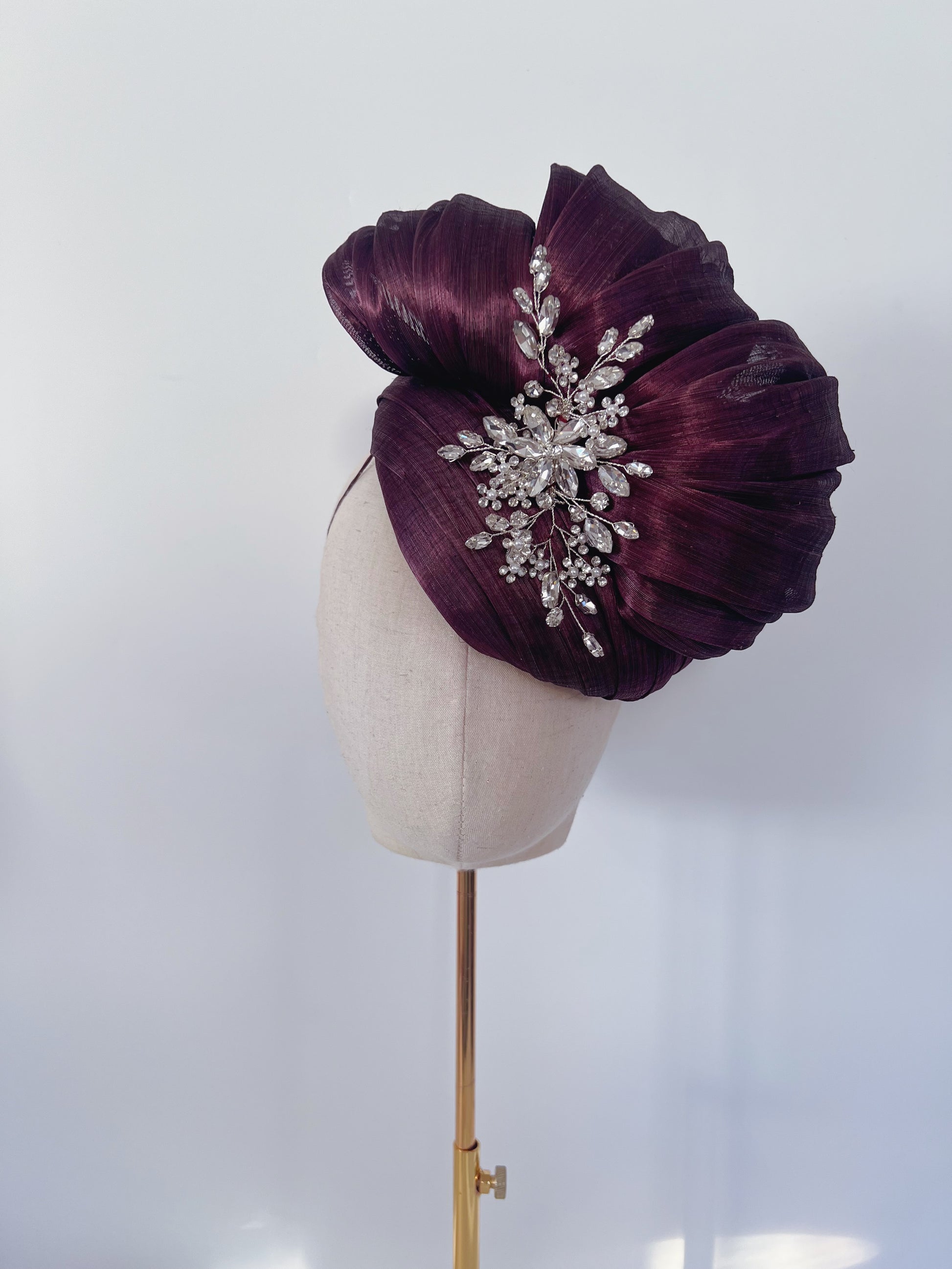 Silk abaca headpiece in plum adorned with silver embellishment